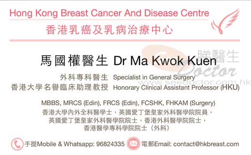 p.s. 決定找馬國權醫生,除了有護士朋友介紹,當然還有看過他的Breast HK 網頁,即使未見其真身,經已感到他的熱誠及同理心。親身見過其真人,與及接受他醫治,相信除了治癒病外,也能治癒病人的心靈,為病人帶來安心及寛慰。