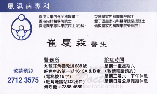 我因雙手手腕持續疼痛多月,驗血報告顯示類風濕因子超標,醫生建議找類風濕專科醫生診治。上網找到崔慶森醫生,家庭醫生正好又推介崔醫生給我。求診當日,藉輪候時間閱讀診所內崔醫生發表有関類風濕關節炎的文章,深入淺出,豐富生動。見到崔醫生,他一輪檢查後!爽快果斷說我患的是「媽媽手」,非類風濕関節炎。崔醫生見我既驚喜又疑惑,再為我驗血驗尿。兩星期後覆診,崔醫生仍排除我患類風濕,惟因尿液顯示有「潛血」,我需再驗尿。崔醫生翌日親自致電我,說我尿液仍有「潛血」,建議我促找專科檢查清楚、找出原因,並即為我寫轉介信。感謝崔醫生排除我患類風濕的同時,更𧫴密覺察及迅速跟進我的檢驗報告,讓我儘快再尋求檢查。兩次求診的經騐,我見證並體驗崔醫生這位醫術精湛、関懷備至的仁醫。
