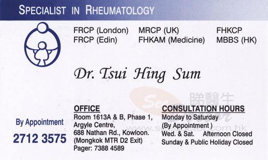 本人患上類風濕關節炎一年多,之前睇過幾個專科醫生但係他們都只是建議採用較昂貴的生物制劑及口服鏢靶藥,而並沒有了解病情嚴重與否. 雖然崔醫生都有提過以上兩種藥物, 但是他建議先採用傳統藥物看看反應如何, 亦都有分析及講解我嘅病情而用藥. 相比之前睇過一些年輕d既風濕科醫生, 崔醫生比我感覺有耐性及顧及病人所需而用藥及治療.