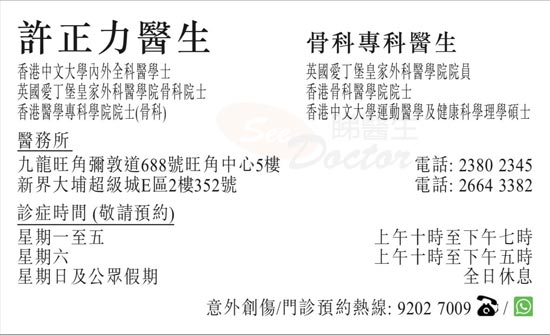 手術後第二天我就能下床及慢步行走,而且沒有任何痛楚,太棒了!至於我的右側鎖骨骨裂,我選擇不做手術,許醫生亦沒強迫我一定要做手術,繼而安排物理治療、儀器和必要的藥物來幫助治癒我的肩膀和背部疼痛。住院期間,他向我解釋我的X光/CT/MRI/骨質報告,回答我的許多疑問,親自清理我的膝蓋傷口,並指教我適當的保險程序,部分亦需要由外科醫生填寫(如果不是因為這次意外,我都不太清楚的)。
