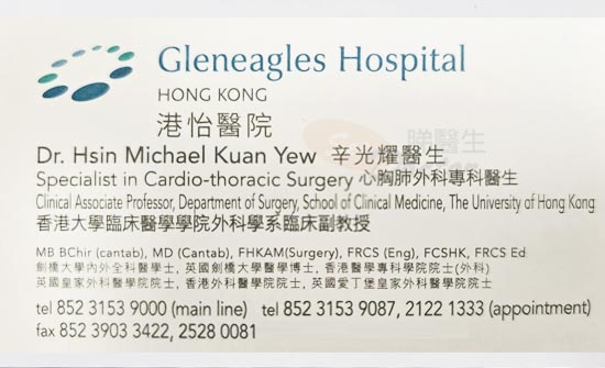 幸好,港怡醫院心胸肺外科辛光耀醫生。佢專業又有耐性,同我們詳細講解外公嘅病情,讓外婆安心。手術當日,我們全家人係手術室門外等得心急如焚,但辛醫生嘅笑容令我地感到希望。手術完後,辛醫生親自出黎同我地講,外公嘅手術非常成功,大家都鬆左一口氣,隨後,外公亦慢慢康復。