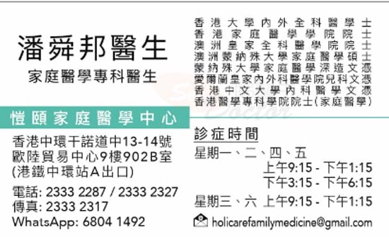 經好朋友介紹潘醫生,已睇第3次,醫生嘅細心問診,詳細嘅解釋,態度親切,令病人心情放鬆,現今好難再遇到咁細心嘅醫生,好開心幸運地搵到!