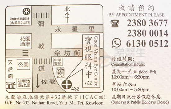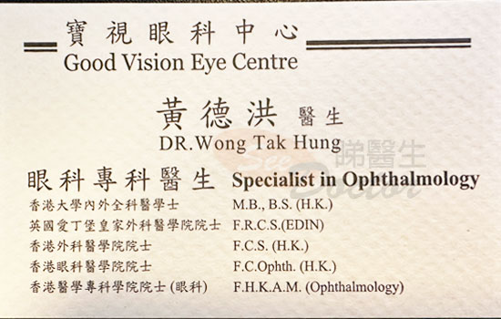 三月底因眼疾求診,黃醫生詳細檢查後表示只是結膜損傷、飛蚊症和乾眼症,沒有其他問題,如仍放心不下,一個月後再覆檢以確定無事。
