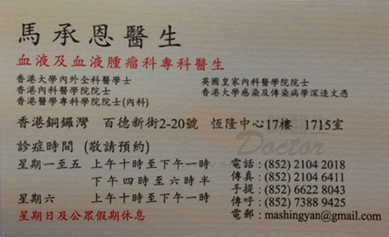 不幸患上白血病,卻又幸運地遇上馬承恩醫生,他不僅專業,而對病人和病人家屬的查詢都有無比的耐性,讓病人在失望的邊緣,燃點希望。所以衷心感激馬醫生!