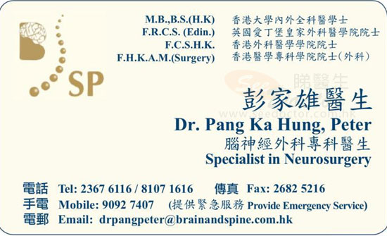 本人媽媽上年年底視力越來越差及記性越來越差,以為是白內瘴及認知障礙, 於是看了兩次眼科醫生,及排了期看認知障礙, 眼科醫生都一致認為是白內瘴,建議做手術,本身都排了期,但年頭時見媽媽不單是記性,連一些說話結構都有問題,所以我經朋友介紹了彭醫生,即是預約見醫生,當日彭醫生聽完我口述的情況已說好大機會是腦瘤,見情況急切,即日照磁力共振,到黃昏時出報告,真如彭醫生所講的差不多,有一個8cm的瘤,所以即時安排入院,要將腦內壓減低,並安排做手術