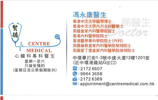 總結:從來未曾遇見一位像馮醫生的仁醫,醫術高明外,更難得的是,每事會由病人角度出發,明白病人苦況。雖說是一位私家醫生,卻每每為病人切想,不會隨便提意作無謂檢查,濫作收費。建議若有各心臟毛病可嘗試求診馮醫生,尤其是心律問題,他更是這方面的專家。