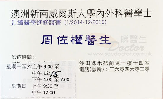 本人至小就有睇開周醫生, 和袁錫璋醫生, 因看診時間而衡量。於星期一, 本人因感冒發燒喉嚨痛, 於穗禾苑袁錫璋診所求診, 吃了一次藥未有見轉好, 但鼻塞呼吸辛苦影響睡眠質素欠佳, 其間吃藥好幾天, 仍然未有轉變, 而且咳嗽喉痛發燒直到10/3仍未見轉好, 當天只好再求診, 今次看周醫生, 進到診所, 護士有禮和主動, 見周醫生時, 他十分主動探問病人其病因, 我覺得他是"醫者父母心"的心腸, 還細心提醒本人要戒口, 不可食什麼, 我覺得他佷有心。