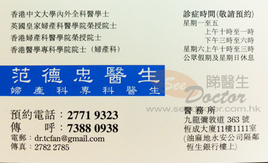 被經痛折磨多年, 分別試過避孕針及假收經針療程, 負作用骨質疏鬆(影響牙齒)及耳鳴.....!!! 療程完畢, 症狀慢慢變本再現, 經痛更甚, 經血量更多, 每日不停係咁痛, 試過兩日內共打8支針止血止痛, 痛苦萬分!!!  搞到無法正常生活, 工作大受影響!!! 真係人都癲!!! 身邊亦無人可問, 只有在網上不停找資料, 找到兩個專科醫生, 驗血指數甚高, 擔心是癌症, 佢哋同時話我不能做微創(因肌瘤已11cm), 所以未能下定決心, 總是猶豫, 但又十分害怕。後來睇到各方面對范德忠醫生的評價, 於是試約診症, 經他診斷後肌瘤確有11cm、他斷定不是癌症, 但他說我的情形係每日都會痛 (的確如此, 斷症準確), 同時他見到我帶來的病歷資料上寫有昂貴的檢查名稱, 他叫我無需浪費金錢做這些意義不大的檢查。此刻感覺眼前這醫生實在不可多得, 他從病人角度出發, 他用咗成個鐘頭講解我的病情及手術情況。 至慘我實在太亂, 好多都記不清, 回家後寫了一篇長長的電郵再問詳細, 范醫生都再次耐心一一解答, 終於令我踏出心理關口接受手術!!! 手術前幾日又氣管不適, 幸得范醫生教我如何處理。 手術日子終於到, 本來3小時多的手術, 因為子宮和腸黏連5 cm多, 范醫生非常非常小心逐 mm 逐 mm 割開,  花近5 小時完成手術,  化驗結果如他所說: 良性。 當晚肚皮上三個傷口只有微微痛, 下身一點痛都沒有, 第二日中午已落床及小便。 其間正站著同家人傾計時, 姑娘到來例行量血壓問:  病人唔見咗, 病人去咗邊? 我舉手話我係病人。 姑娘話: 你一點都唔似病人。 這都是多得范醫生精湛技術! 更甚是手術後因為私人問題心情極差, 范醫生都耐心安慰。 這樣的一個有技術、有醫德、有耐性又細心, 充滿慈愛的醫生, 又一次得以證實!!!