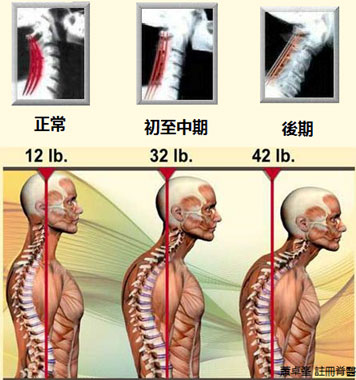 頭部前傾,失去頸椎正常弧度,肩頸變相要承受~32磅的重量,肌肉久不久就會酸痛,按摩亦只能短暫舒緩