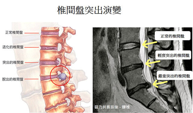 椎間盤突出是指啫喱狀的髓核因外力或壓力被擠出纖維環,其後髓核壓迫到周邊的神經,引發手或腳出現痛楚、麻痺或無力等症狀。