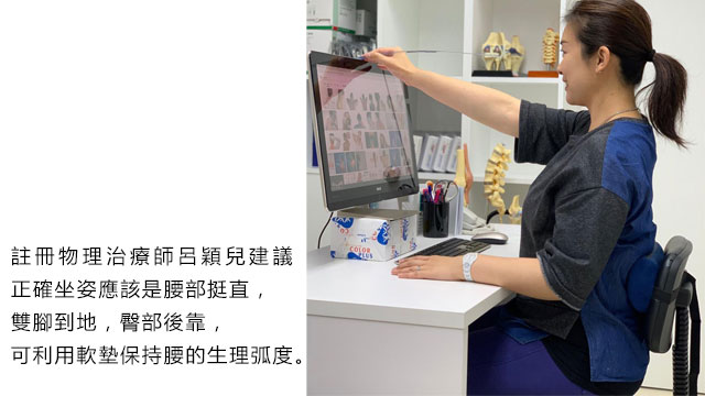 根據註冊物理治療師建議,正確坐姿應該是腰部挺直,雙腳到地,臀部後靠,可利用軟墊保持腰的生理弧度。至於螢幕與身體維持約一隻手臂的距離,水平視線在螢幕的第一行,手肘、髖關節和膝關節保持90度。