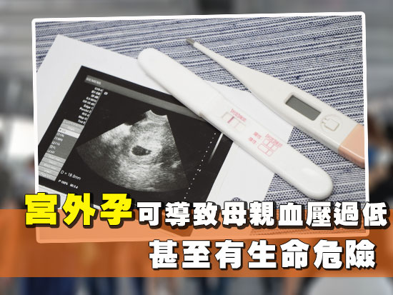 宮外孕的徵狀跟一般懷孕一樣:停經和陽性的驗孕結果;分別在於前者腹痛和下體出血才察覺有異。宮外孕又稱異位妊娠,指的是胚胎生長在子宮以外的地方,如輸卵管或卵巢。每100個懷孕個案就會有一個是宮外孕。宮外孕是不會演變成正長的懷孕,隨著胚胎的發育生長,就會撐破輸卵管或卵巢的有限空間,引致腹腔內出血,導致母親血壓過低、休克,甚至有生命危險。
