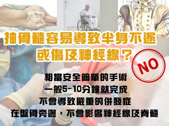 抽骨髓是一個很安全的手術,其實也相當的簡單,一般來説五至十分鐘就可以完成。如果醫生小心做,應該不會導致嚴重的併發症。因爲做的地方其實是在盤骨旁邊,所以不會影響到神經線、脊髓。