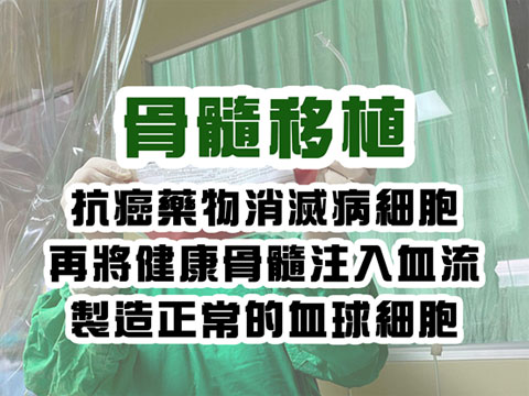 先以抗癌藥物將體內病細胞完全消滅,再將獲捐贈的健康骨髓注入病人的血流內,讓健康的骨髓細胞在體內開始製造正常的血球細胞。