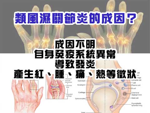 類風濕關節炎屬於自身免疫系統異常而出現的慢性炎性關節疾病。當自身免疫系統出現異常,導致體內細胞會自己攻擊自己。體內免疫細胞因為誤以為關節是一些外來的細菌病毒,從而去攻擊關節,導致發炎,而產生紅、腫、痛、熱等徵狀。至於爲甚麼會有這樣的情況出現,至今仍然是成因不明。