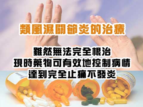 類風濕關節炎無法完全根治。不過現時的醫學技術進步,類風濕關節炎的治療比以前改善了很多,藥物能夠有效地控制病情。雖然依然沒有辦法完全根治,但是可以令關節炎大大受到控制,不但能夠止痛,還可以達到完全不發炎的效果。只要關節不發炎,自然就不會有痛楚,而關節亦不會受到損害。