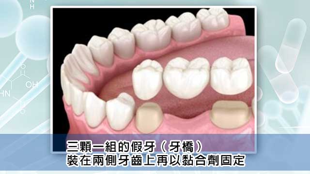• 牙橋:牙橋需要磨細兩邊健康的牙齒為橋樑,犧牲兩隻真牙的健康以支撐假牙,相當可惜。與活動假牙一樣,牙橋沒有人工牙根,牙齦久而久之亦會萎縮。