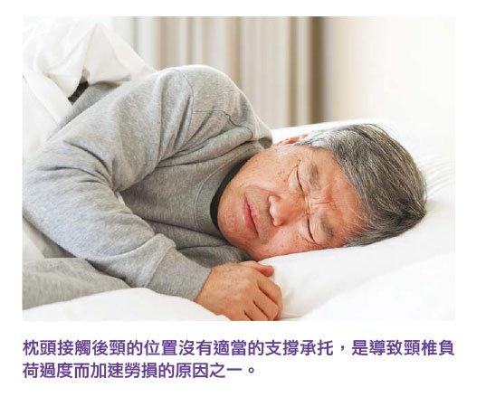 頸椎病是指因頸椎間盤退化、勞損或受傷而引起的頸椎病變,也就是我們常說的低頭一族。病變導致位於頸椎中央的神經管道或椎間神經孔的空間變得狹窄,壓迫或刺激頸部的中樞神經脊髓、神經根或交感神經,造成神經受壓症狀。隨着年齡增長,如果頸椎長期姿勢不正確,例如低頭工作、看手機或過度仰頭工作;側睡、坐着或趴着睡;枕頭過高或過低,枕頭接觸後頸的位置沒有適當的支撐承托;長期手臂或肩膀負重;不斷的運動外傷等等,都會導致頸椎負荷過度而加速勞損。