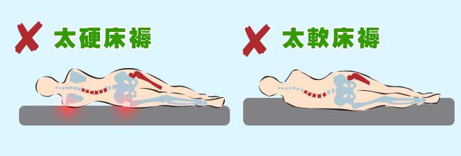 當身體平躺於床褥上,將產生兩個主要負重點,其一:近胸椎位置,其二:近臀部位置,若床褥太硬,重力只集中於這兩點,腰椎形成凌空狀態,沒有任何承托,趟若床褥太軟的話,脊骨則太貼服床褥,容易令腰椎因臀部重力牽引而向下墜,不能提供適當的承托效果。