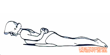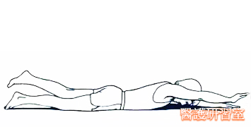 上半身如圖示位置,保持髖關節緊貼地面,同時保持下腰部及臀部放鬆