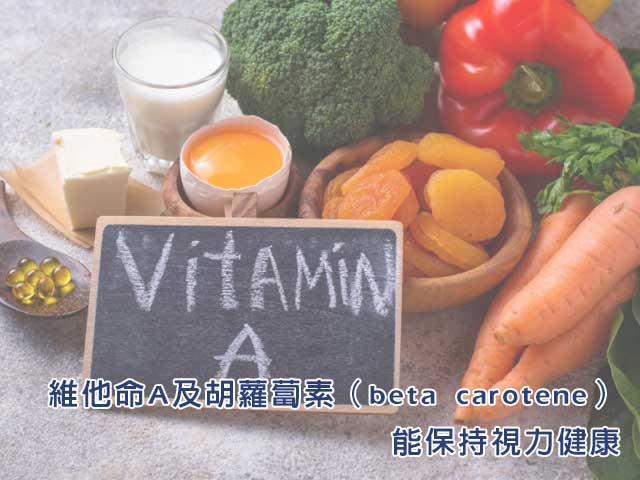 屬脂溶性維他命,除了用作維持正常人體免疫功能、生殖功能及細胞生長和傳達,保持視力健康亦是維他命A及胡蘿蔔素(beta carotene)的功能,它是視網膜色素的成份之一。人體從食物中攝取胡蘿蔔素,然後轉化為維他命A作身體運作之用。從食物中攝取足夠維他命A及胡蘿蔔素有助預防夜盲症及減低眼部受感染的機會。
